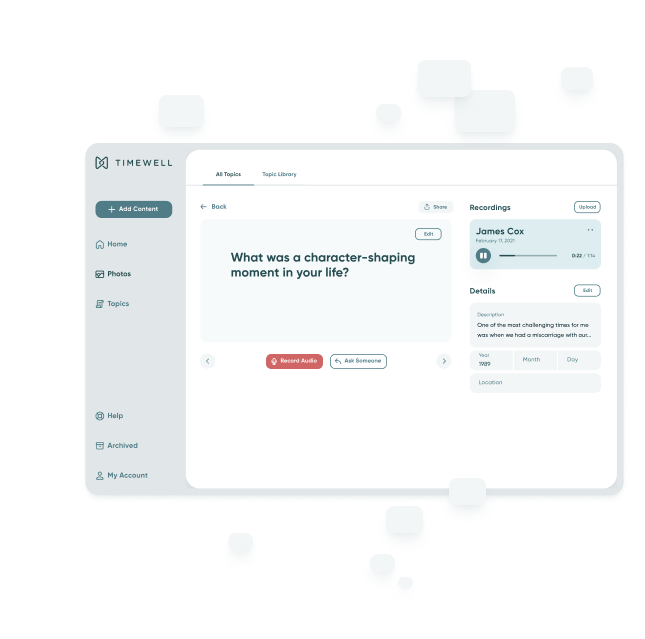 "TimeWell is the only solution that brings photos, voice and prompts together in a beautiful, dead-simple way that can last a lifetime. And, I can easily share them with (and even collect them from) my family and friends. I’m happy to finally have this!"