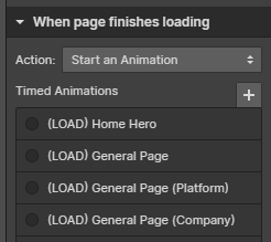 When a page finishes loading we have a chain of animation which will ease certain parts of the website. You shout note that all pages will follow a similar loading pattern which brings in primary elements. This includes the navigation, title text & buttons etc. You can see these interactions under the When Page Finishes Loading of your interactions panel. In most cases pages will use the General page load to effect the common elements. This is marked with the '⭐'